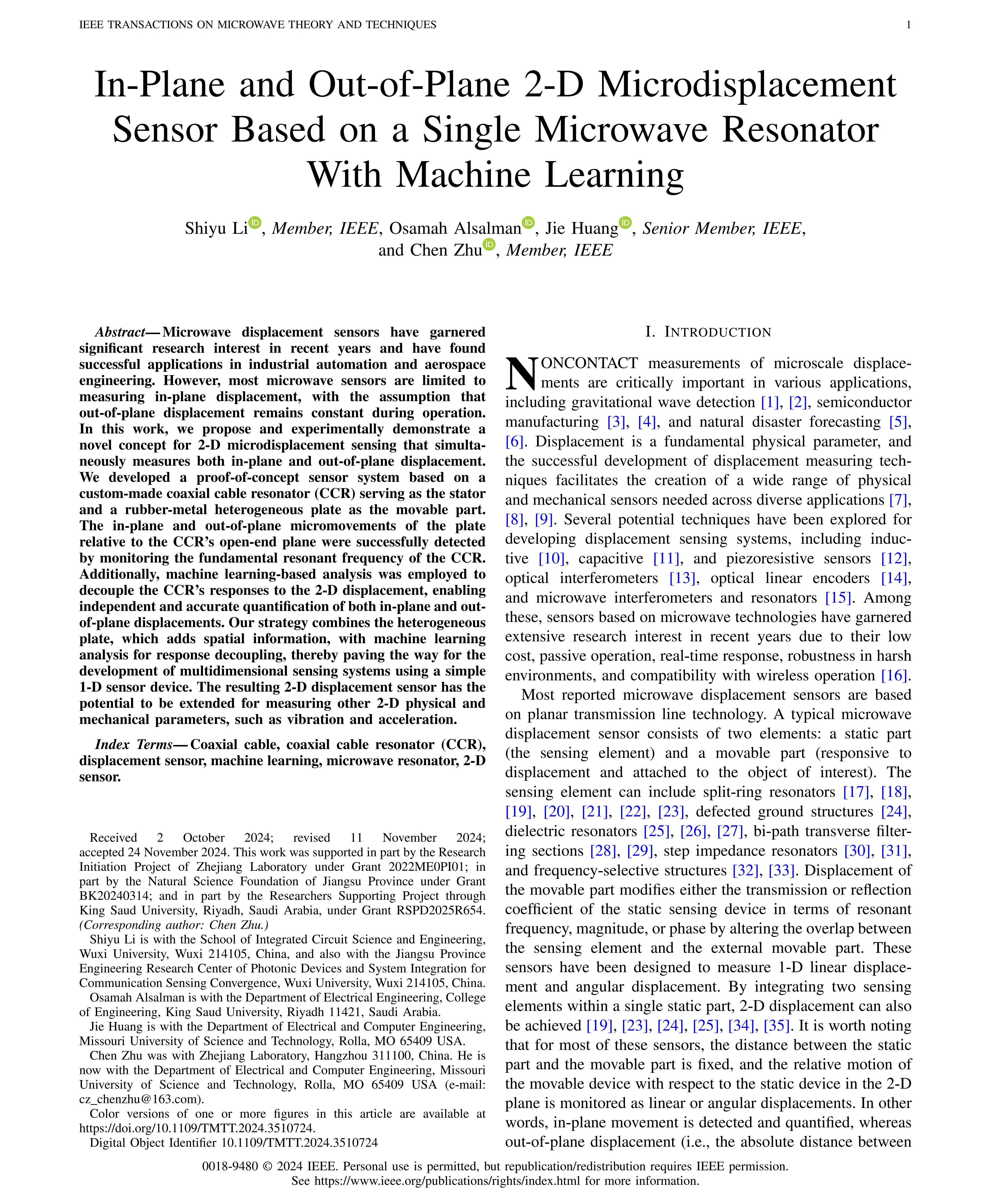 近日,我校集成电路科学与工程学院李世雨与密苏里科技大学等单位合作,在IEEE Transactions on Microwave Theory and Techniques上发表论文《In-Plane and Out-of-Plane 2-D Microdisplacement Sensor Based on a Single Microwave Resonator With Machine Learning》(原文链接:https://doi.org/10.1109/TMTT.2024.3510724),无锡学院为第一署名单位,李世雨为第一作者。IEEE Transactions on Microwave Theory and Techniques是微波、射频技术领域的国际顶级学术期刊,为中科院一区Top期刊。该项研究紧密贴合江苏省1650产业体系以及无锡市465现代产业体系中物联网先进产业集群的传感器技术领域。