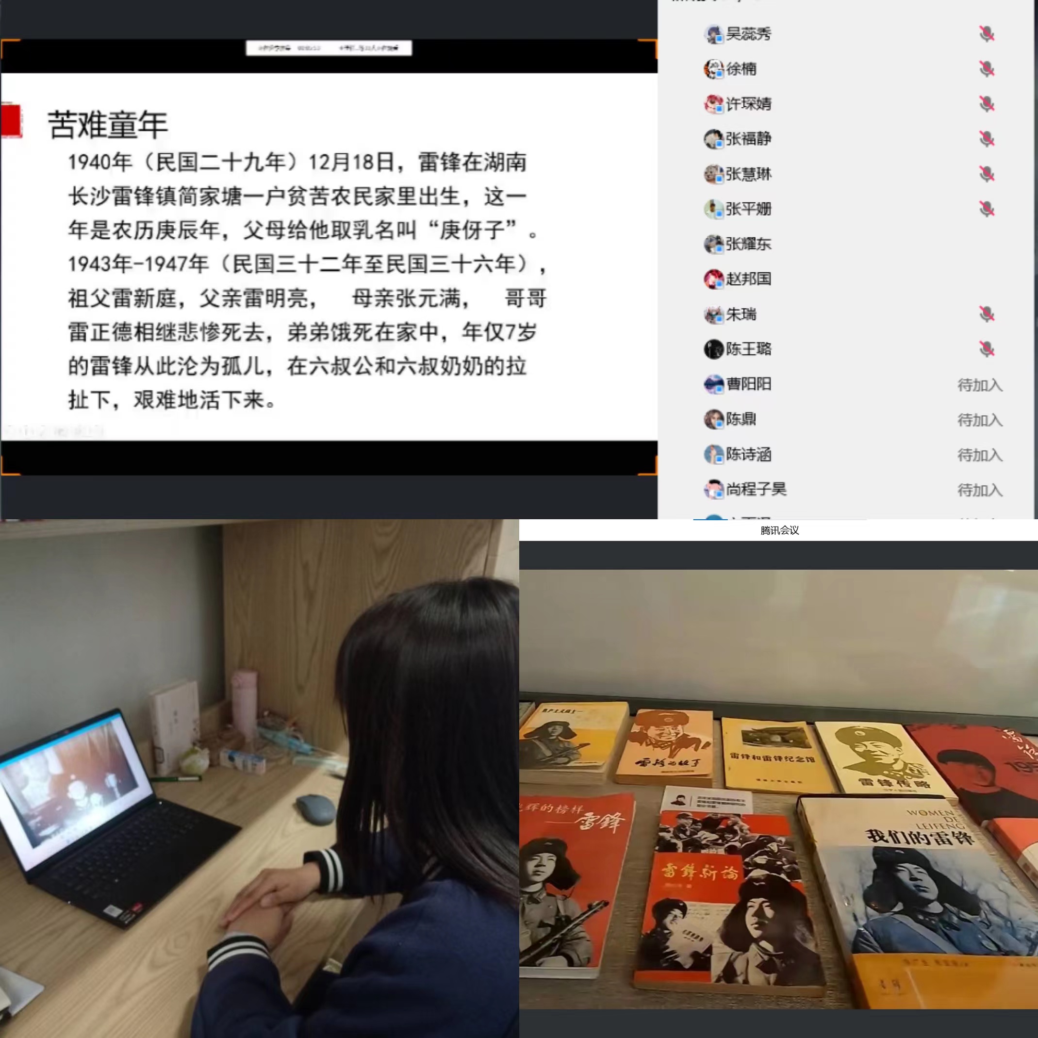 雷锋精神我发扬。“我选A……”,“雷锋曾说过‘我愿做一颗螺丝钉’”,“答案是C,雷锋精神的核心是为人民服务……”由21信工2团支部开展的学习雷锋精神知识竞赛活动正在如火如荼地进行中,同学们聚集线上参与答题,现场气氛热烈。此外,还有多个团支部通过召开线上主题班会、观看《雷锋》电影等形式,学习雷锋精神,传播青春力量,深入体会雷锋精神,引导青年践行使命。