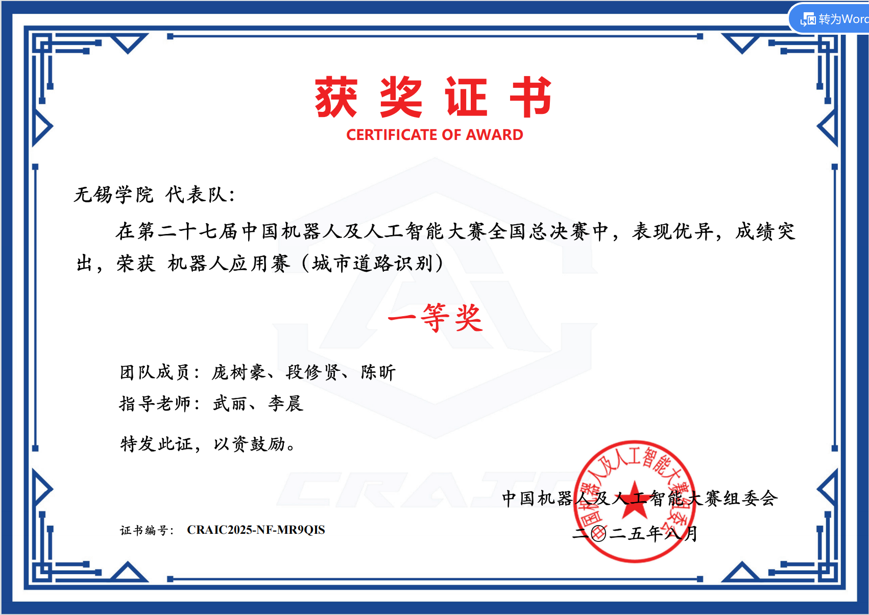 城市道路识别竞赛获奖证书