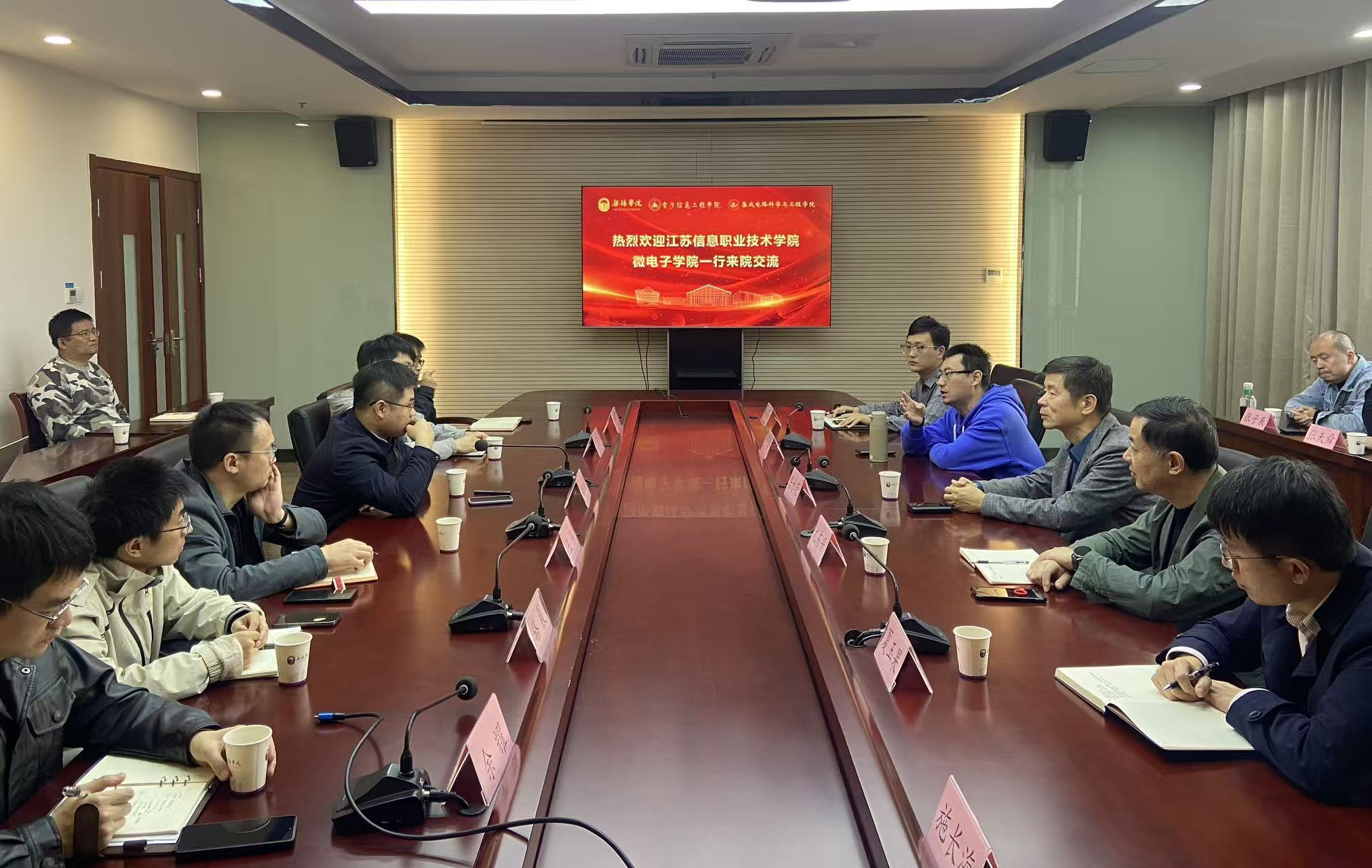 11月13日下午,江苏信息职业技术学院微电子学院率队来我校开展交流座谈。江苏信息职业技术学院微电子学院院长居水荣、科技处处长尤东升、副院长夏玉果,我校电子信息工程学院院长李松斌、副院长王伟及双方相关领导、骨干教师代表参加交流。