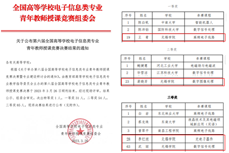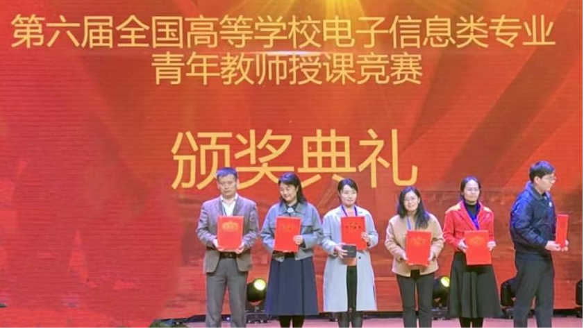 2023年3月26日,第六届全国高等学校电子信息类专业青年教师授课竞赛全国总决赛落下帷幕,电子信息工程学院(简称电信院)青年教师王青在此次竞赛中获得全国一等奖,裴晓芳获全国二等奖、武丽和李红旭获全国三等奖,获奖率高达100%。全国仅有四所高校获“优秀组织奖”荣誉称号,我校是其中之一。自2020年参赛以来,我校电信院参赛教师获奖等级和获奖数量再上新台阶。