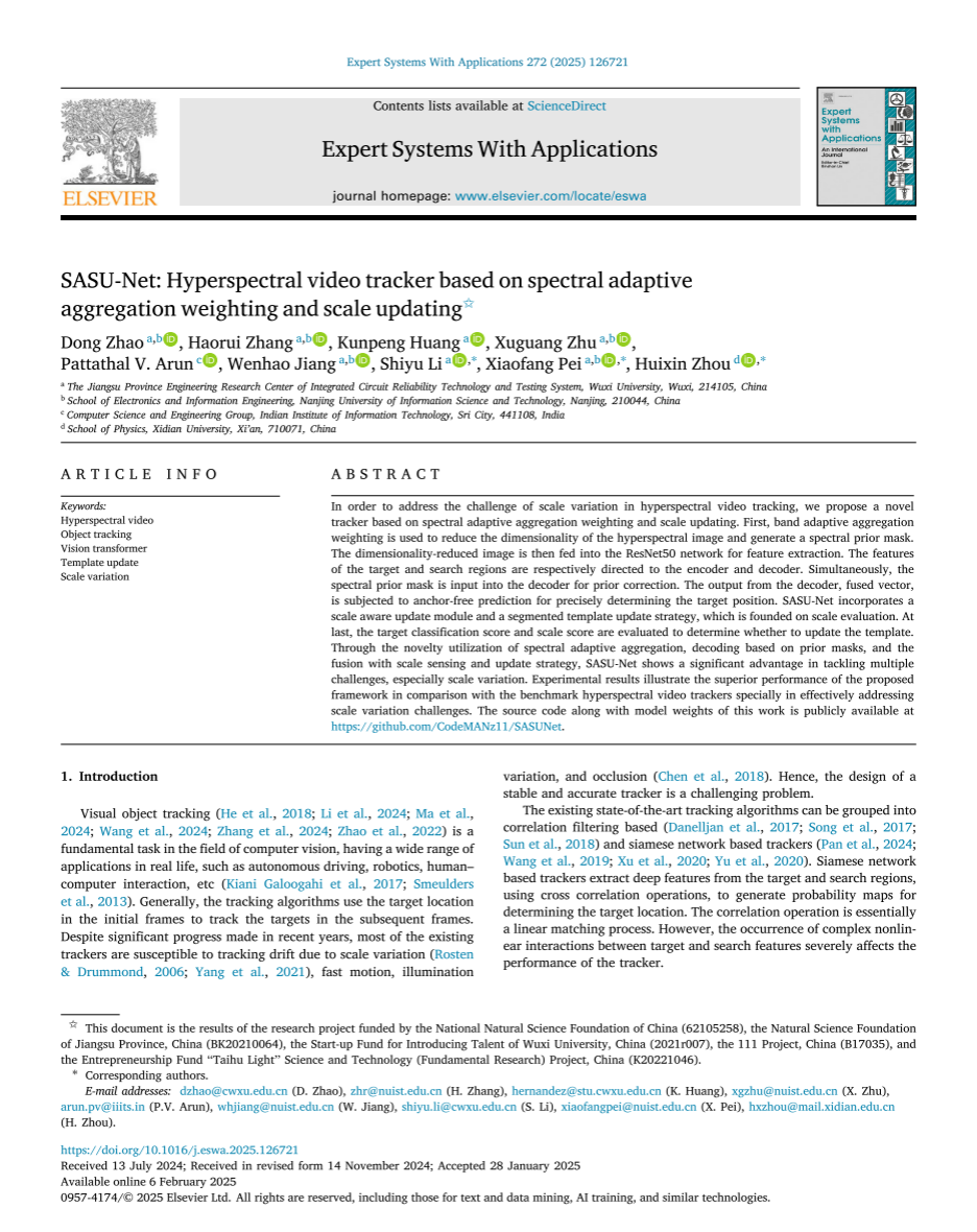 近日,我院赵东副教授团队,联合印度信息技术学院PattathalV. Arun博士与西安电子科技大学物理学院周慧鑫教授团队在高光谱目标跟踪领域取得重要进展,相关研究成果《SASU-Net: HyperspectralVideoTracker based onSpectralAdaptiveAggregationWeighting andScaleUpdating》于2025年2月6日在线出版于国际知名学术期刊Expert Systems With Applications(中科院SCI一区Top)。我院赵东副教授为第一作者,我院为第一通讯单位。原文链接:https://doi.org/10.1016/j.eswa.2025.126721(图1)。