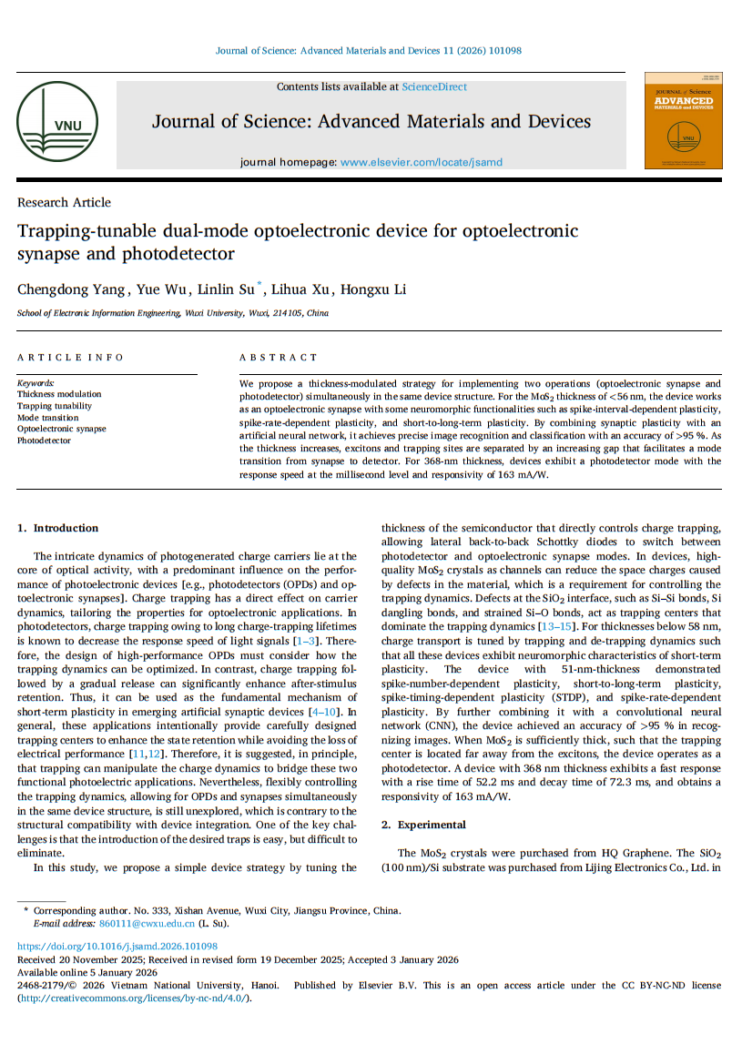 电子信息工程学院杨成东团队开展的题为“Trapping-tunable dual-mode optoelectronic device for optoelectronic synapse and photodetector”的研究论文已于2026年1月5日发表于国际期刊Journal of Science: Advanced Materials and Devices。(原文链接:https://doi.org/10.1016/j.jsamd.2026.101098)。